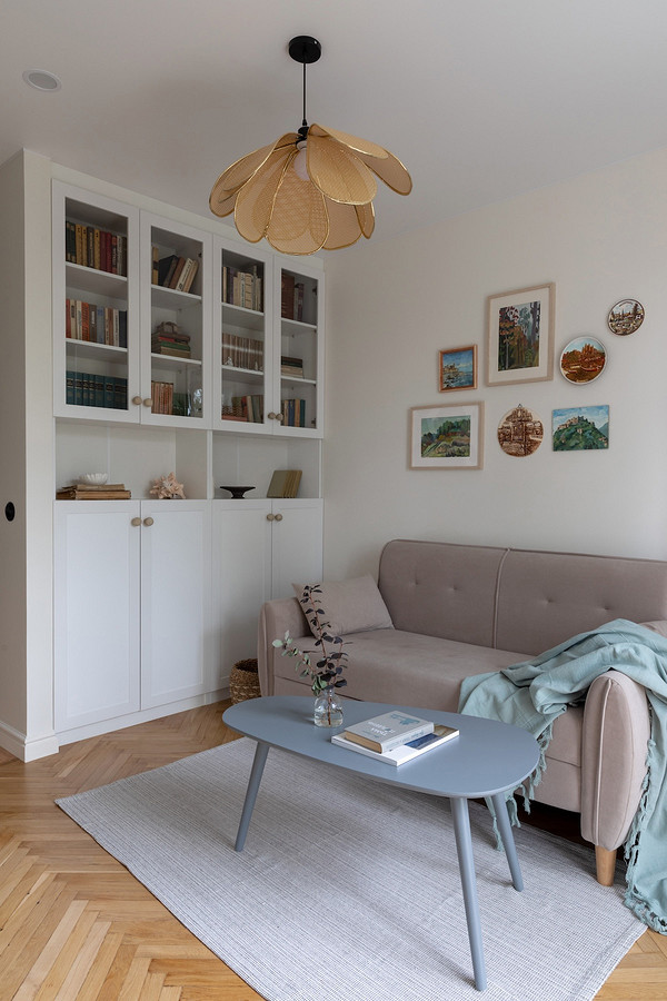В гостиной поставили готовые книжные шкафы — заранее построили нишу по размеру этих шкафов. Хозяйка оставила для жильцов книги, которые были в квартире. Нижняя часть шкафов закрытая, для разных мелочей, чтобы не создавать визуальный хаос. Подобрали компактный раскладной диван.