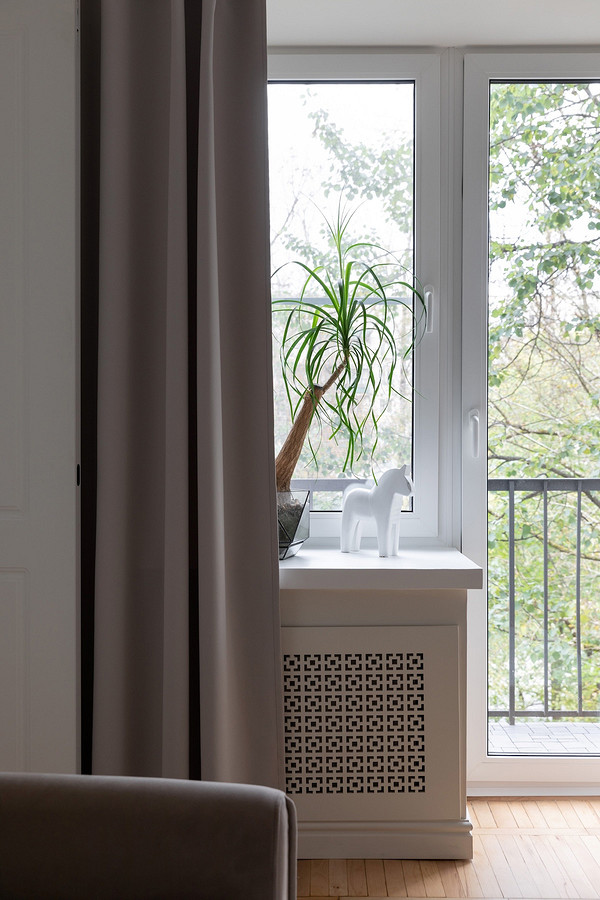 Радиаторы отопления менять не стали — их закрыли декоративными решетками. В гостиной и спальне отреставрировали бетонные подоконники, а на кухне установили подоконник из того же материала, что и кухонная столешница. Его высоту подняли до уровня кухонной столешницы, чтобы задействовать как дополнительную рабочую поверхность.