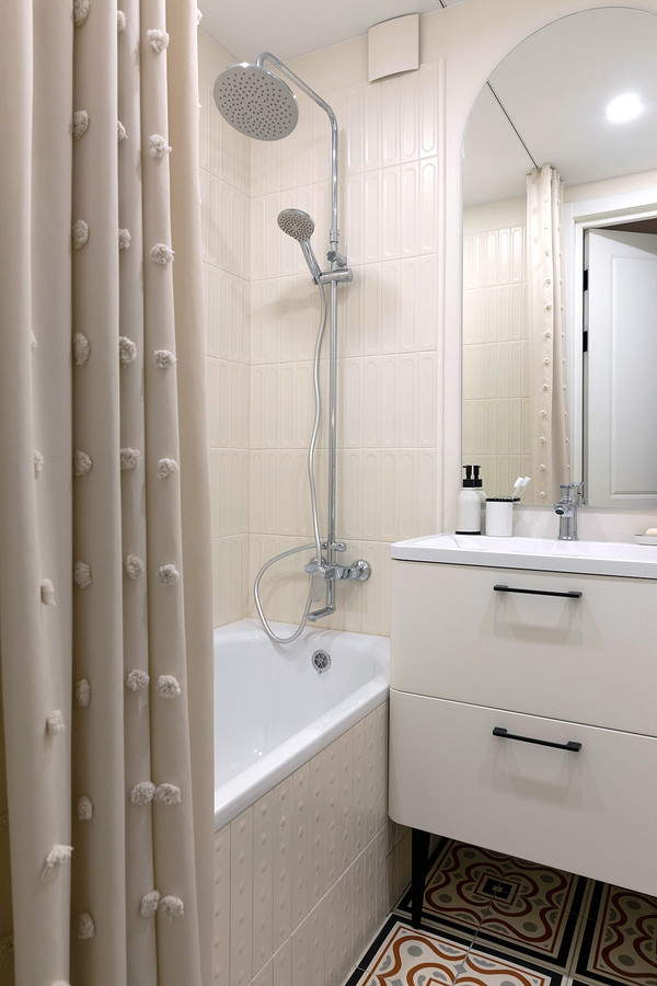Оформление квартиры пошло от…напольной плитки в санузле. Дизайнер выбрала яркую плитку с рисунком, к ней подобрала мелкоформатную плитку бежевого цвета, а к ней — моющуюся бежевую краску. Этот бежевый цвет краски использовали потом на всех стенах квартиры. «Стыковка плитки на стене с покраской проходит через молдинг. Такое решение неслучайно: во-первых, мы избежали резки плитки, использовали только целые плашки (не хватало буквально 2,5 см по вертикали до края ванны), во-вторых, закрыли торец плитки, сделали переход от одного материала к другому плавным», — комментирует Кристина.