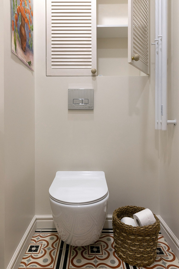 Для ванной комнаты выбрали тумбу под раковину с выдвижными ящиками и сделали шкафчик для хранения над инсталляцией унитаза.