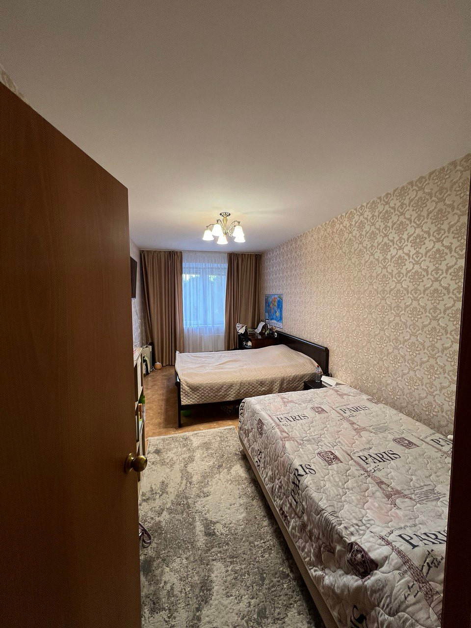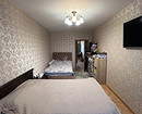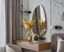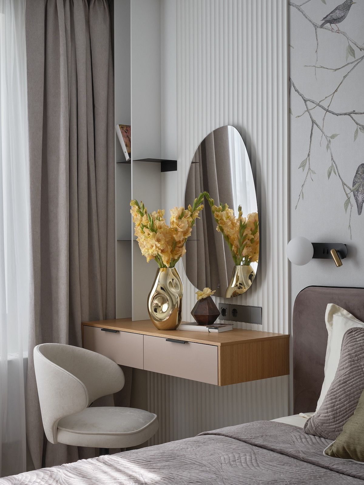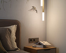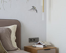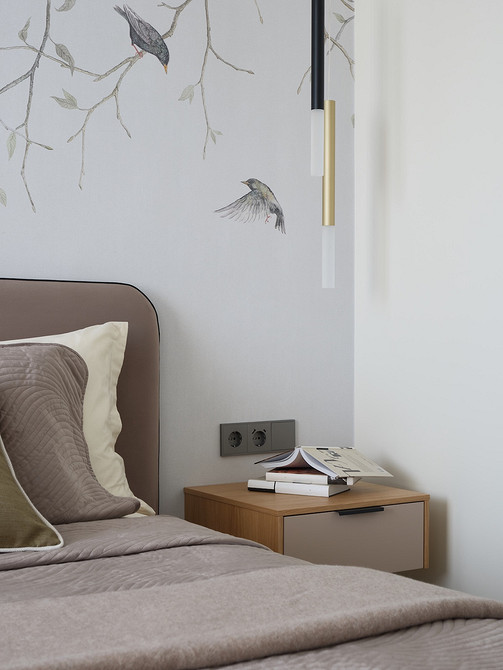 Для акцента использовали стеновые панели, чтобы выделить туалетный столик в спальне и телевизор в гостиной. Также в спальне на стене за изголовьем кровати поклеили обои-панно с рисунком птиц на ветках. «Это добавило выразительности и природности, также на картинке удачно ветки свисают, не касаясь кровати, что дает нам эффект воздушности, высоты, легкости, добавляет пространству объема», — комментирует дизайнер.