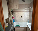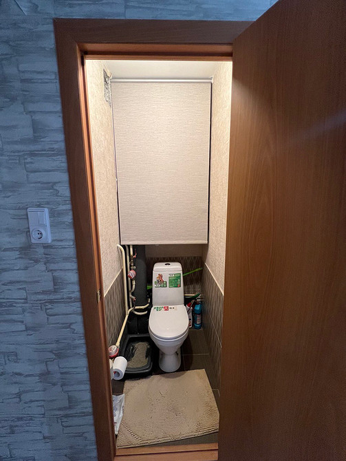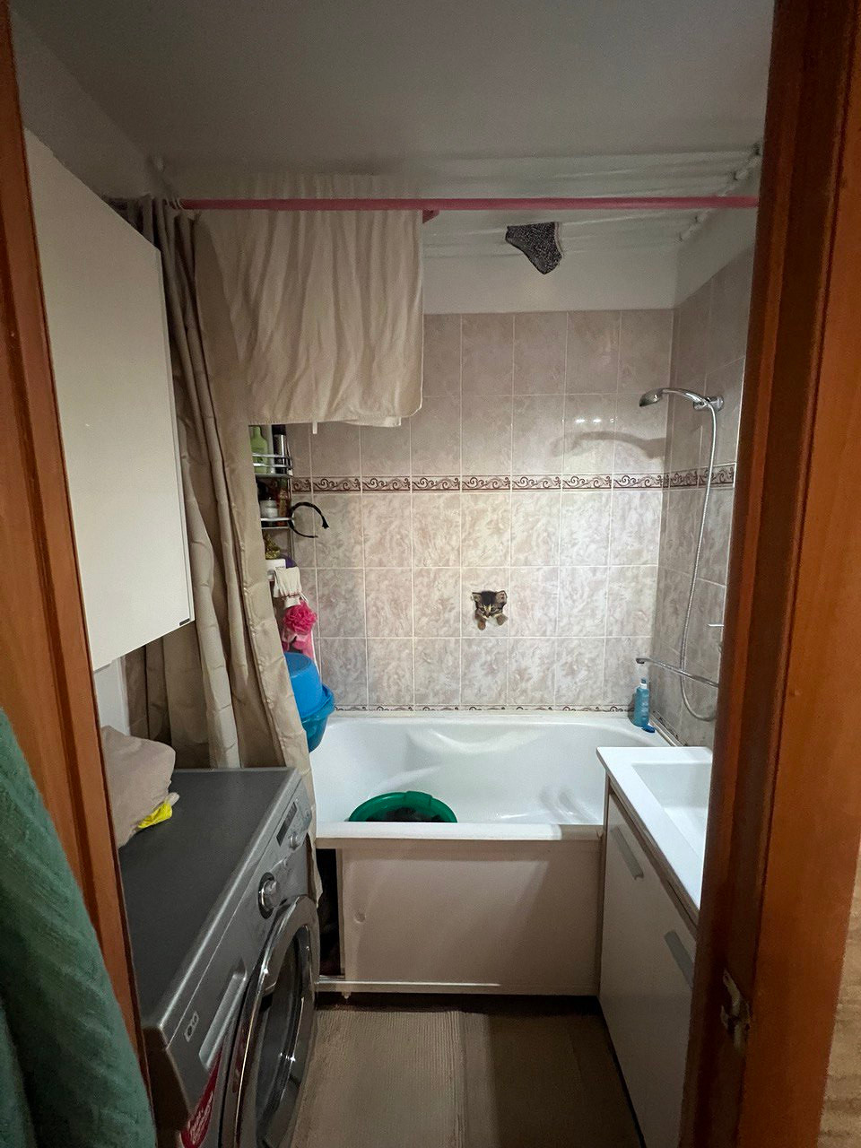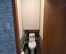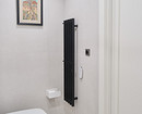 В ванной комнате удалось разместить колонну из стиральной и сушильной машин в шкафу с жалюзийными дверками. Над колонной осталось место для хранения. В тумбе под раковину сделали отделение для кошачьих лотков. Также хранение предусмотрели над инсталляцией унитаза.