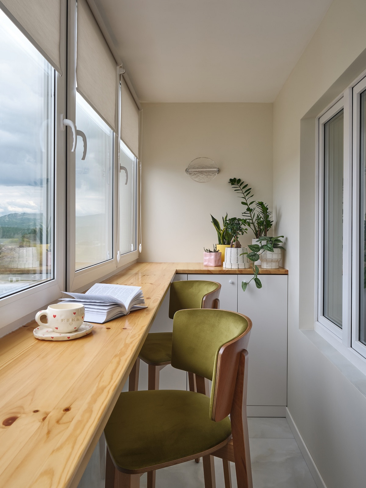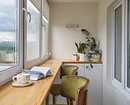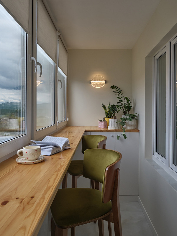 Балкон тоже стал функциональной частью квартиры. Там сделали барную стойку и предусмотрели шкаф для хранения садоводческих принадлежностей.