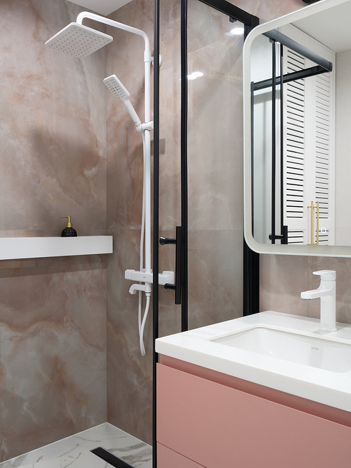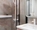 На пол в прихожей (у входной двери), на кухне и на балконе уложили керамогранит под мрамор. Его же использовали на полу в ванной комнате. На стенах в душевой и над раковиной уложили керамогранит под розовый кварц. Это добавило нежный акцент.