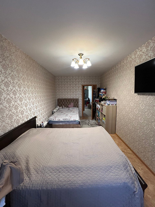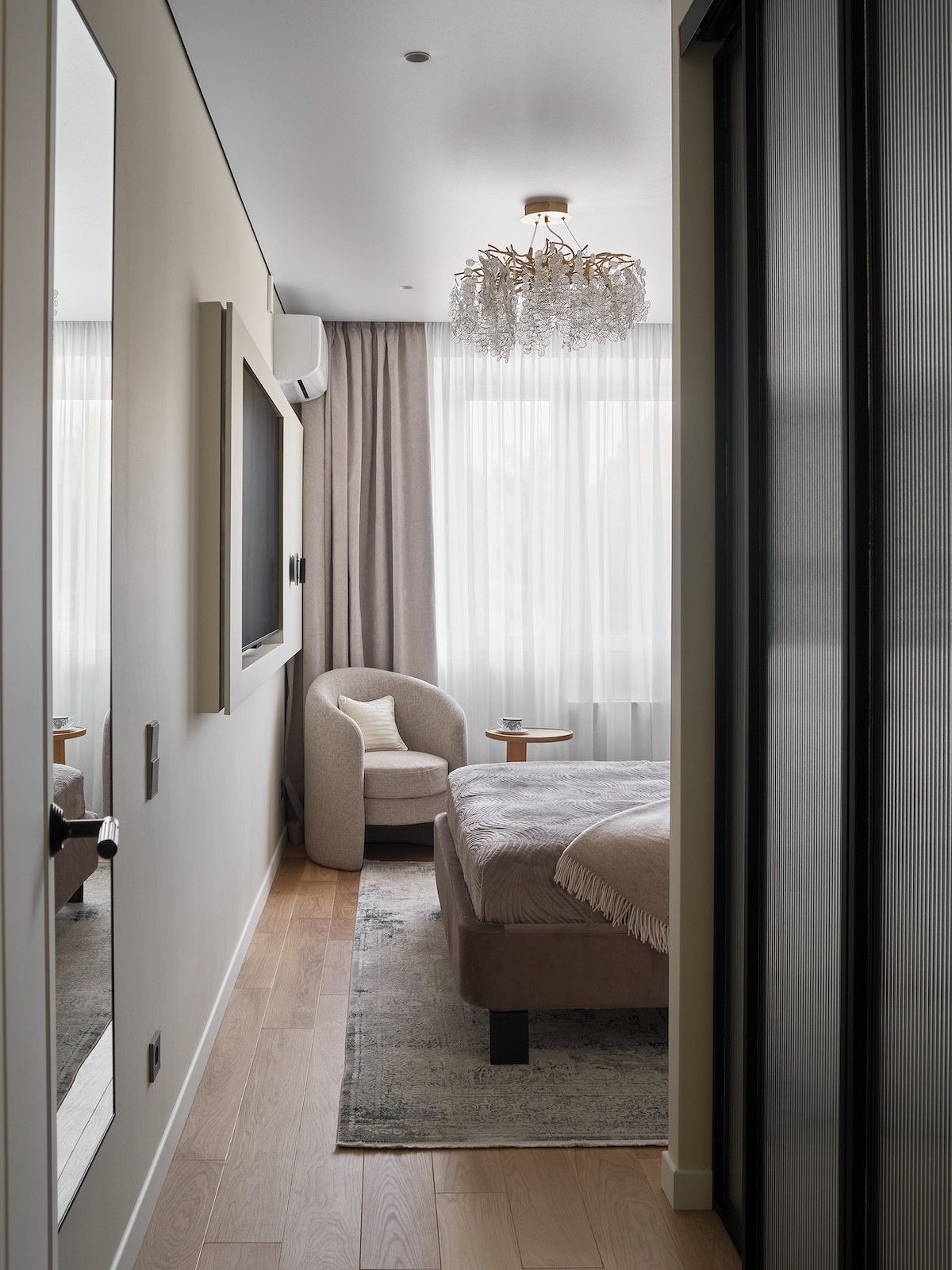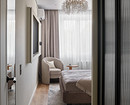 За счет того, что сделали гардеробную, сама спальня получилась более правильной квадратной формы. Уместили комфортную двуспальную кровать, тумбочку, туалетный столик, кресло для чтения. Напротив кровати повесили телевизор.