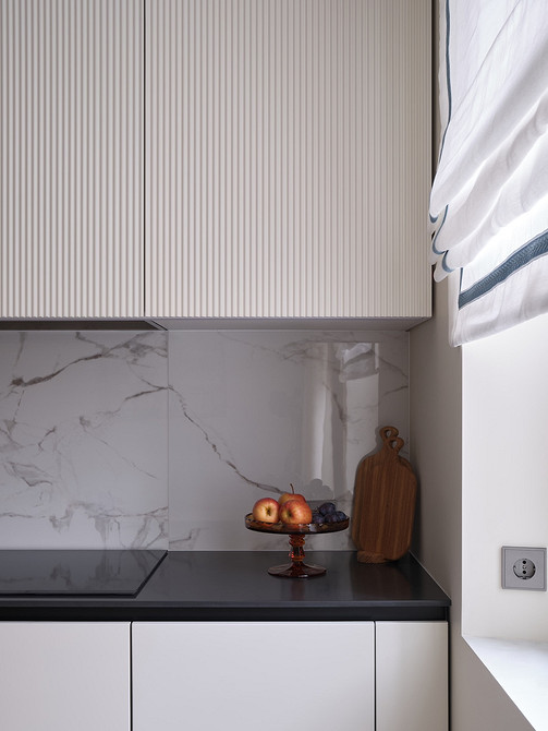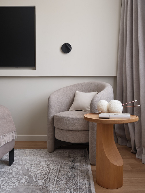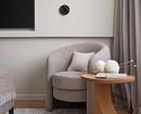 «Заказчики просили сделать максимально нейтральный и мягкий проект. Основная задача — обеспечить комфорт кошкам, которые привыкли жить в большом доме и имели выход на улицу. В городской квартире им нужно было установить два лотка, игровой комплекс, подоконник для наблюдений за обстановкой на улице. Большое внимание заказчица уделила техническому оснащению квартиры, мы должны были разместить стиральную и сушильную машины, робот-пылесос, кухонную технику, встроенную в пеналах, два больших телевизора, wi-fi точки в каждой комнате, кондиционеры, электрические карнизы, подвесной умный унитаз, а также предусмотреть разные сценарии освещения. Мама заказчица любит читать и вязать, поэтому в спальне и гостиной для нее предусмотрены удобные кресла с подсветкой для чтения, большие шкафы для хранения книг, а также стеклянный книжный стеллаж для коллекционных изданий», — рассказывает Владислава.