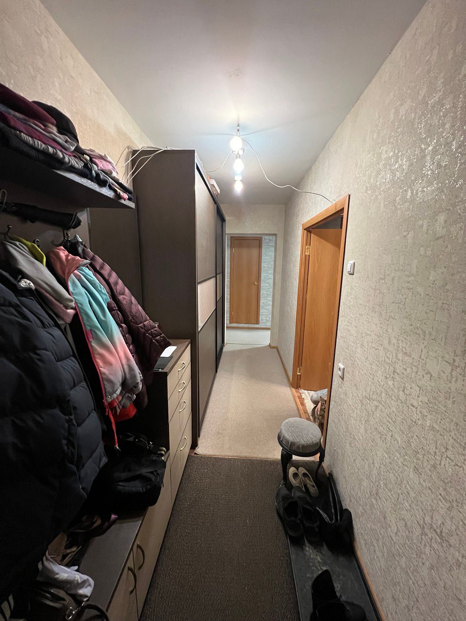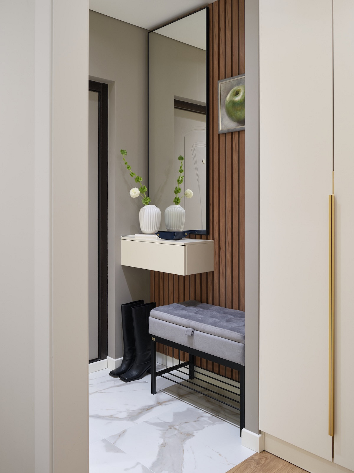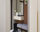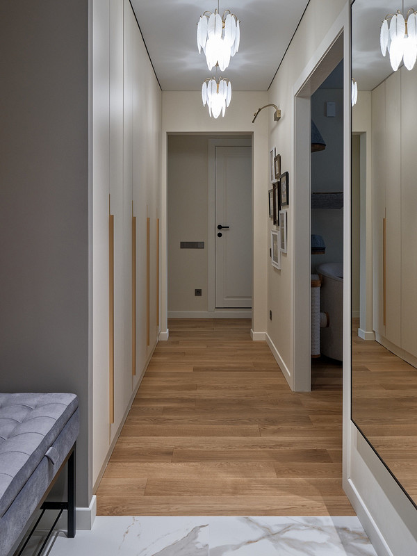 Владислава продумала вместительные системы хранения в каждой комнате. При входе разместили консоль для мелочей и банкетку, куда удобно присесть. Прямо по коридору встроили шкаф глубиной 40 см. В нем предусмотрены секции под верхнюю одежду и обувь и хозяйственное хранение: под швабру и ведро, под пылесос, выдвижные ящики для мелочей и полки для чемоданов.