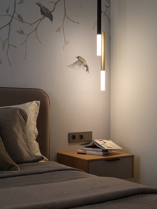 В каждом помещении предусмотрели несколько сценариев освещения: потолочный свет, люстры, бра, подвесы, скрытые подсветки. «Основное освещение — температурой 3 000К, подсветка и бра — 2 500К, то есть более мягкий и теплый свет. Основной принцип подбора освещения — сделать больше нормы и возможность регулировать по ходу жизни, чтобы у хозяйки была возможность самой настроить режим и насыщенность ламп, включить сразу встроенный свет и люстру или что-то одно, включить бра и подсветку вечером или ничего не включать. У мамы заказчицы не было опыта с разными сценариями освещения, поэтому мы старались сильно не усложнять, но при этом сделать удобные и понятные схемы на выключателях, чтобы можно было настроить комфортное освещение самостоятельно», — рассказывает Владислава.