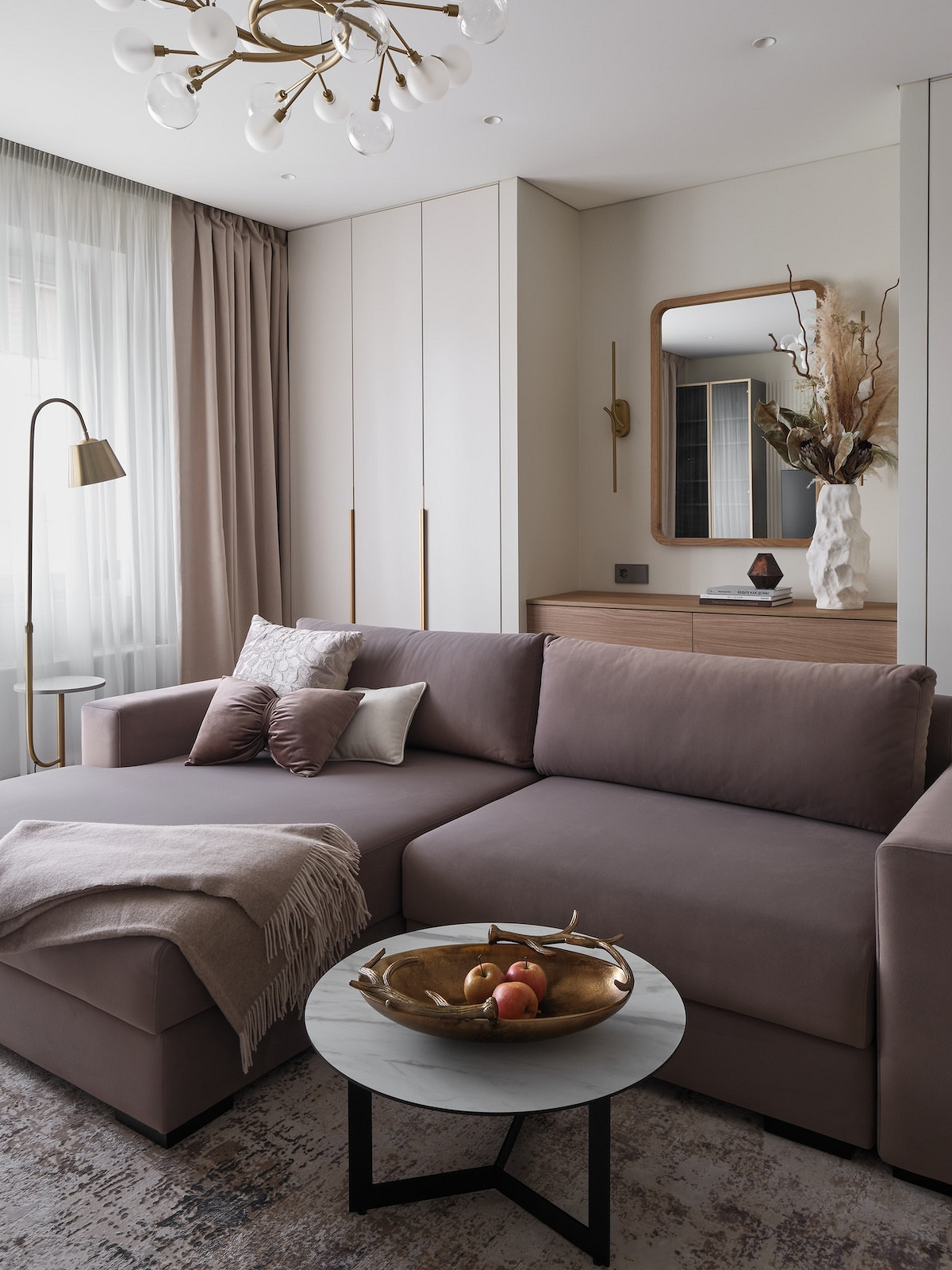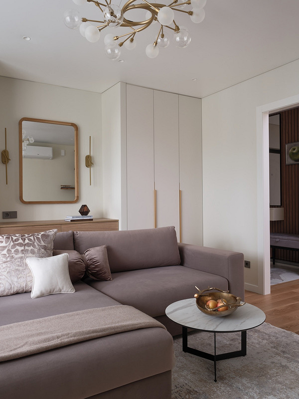 В гостиной за спинкой дивана расположили симметричные закрытые шкафы: в одном из них прячутся утюг и выдвижная гладильная доска, там же предусмотрено место для робота-пылесоса с розетками для техники. Другой шкаф — с выдвижными ящиками и полками, где хозяйка хранит книги. Между ними — консоль с выдвижными ящиками для документов.