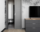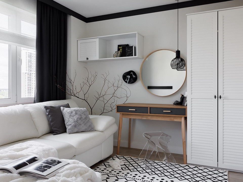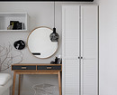 Продумали и бытовое хранение, которое необходимо в каждой квартире: шкаф для одежды при входе в прихожей, шкаф в спальне, а также система хранения с рабочим местом, шкаф и столик в кабинете-гостевой. В гостиной — тумба под телевизор в виде вместительного комода.