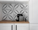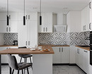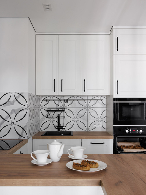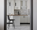 Там, где это было необходимо (прихожая, кухня) на пол уложили плитку. Для прихожей выбрали отделку с ненавязчивым рисунком, а для кухни — под мрамор. Ванная комната оформлена полностью плиткой под мрамор. В санузле скомбинировали рисунки под мрамор (на стенах) и орнаментальную плитку, как в прихожей (на полу).