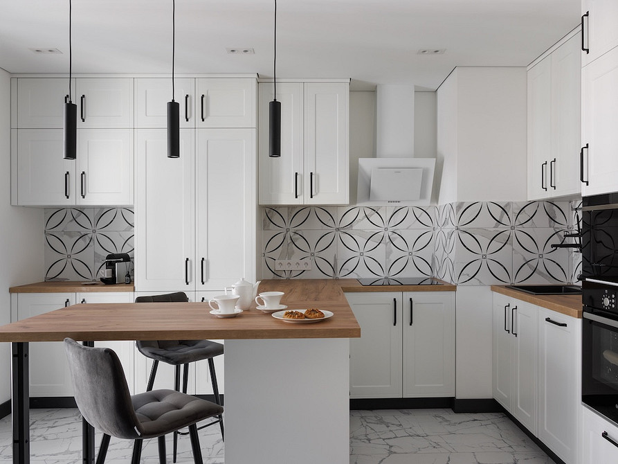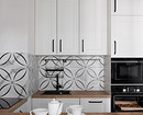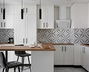 Так как хозяйка любит готовить, кухню сделали максимально функциональной, предусмотрев места для хранения для каждой мелочи. Получился гарнитур со сложным конструктивом, разнообразными ящиками и полками. Конечно же, встроили всю необходимую технику. Вместо обеденного стола решили сделать барную стойку. На балконе, примыкающем к кухне, разместили шкаф для заготовок и дополнительную морозильную камеру.