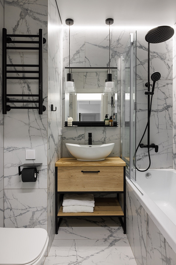 В санузел удалось установить колонну из стиральной и сушильной машины. Это освободило основную ванную и позволило сделать ее более просторной. Там для хранения предусмотрели тумбу под раковину.