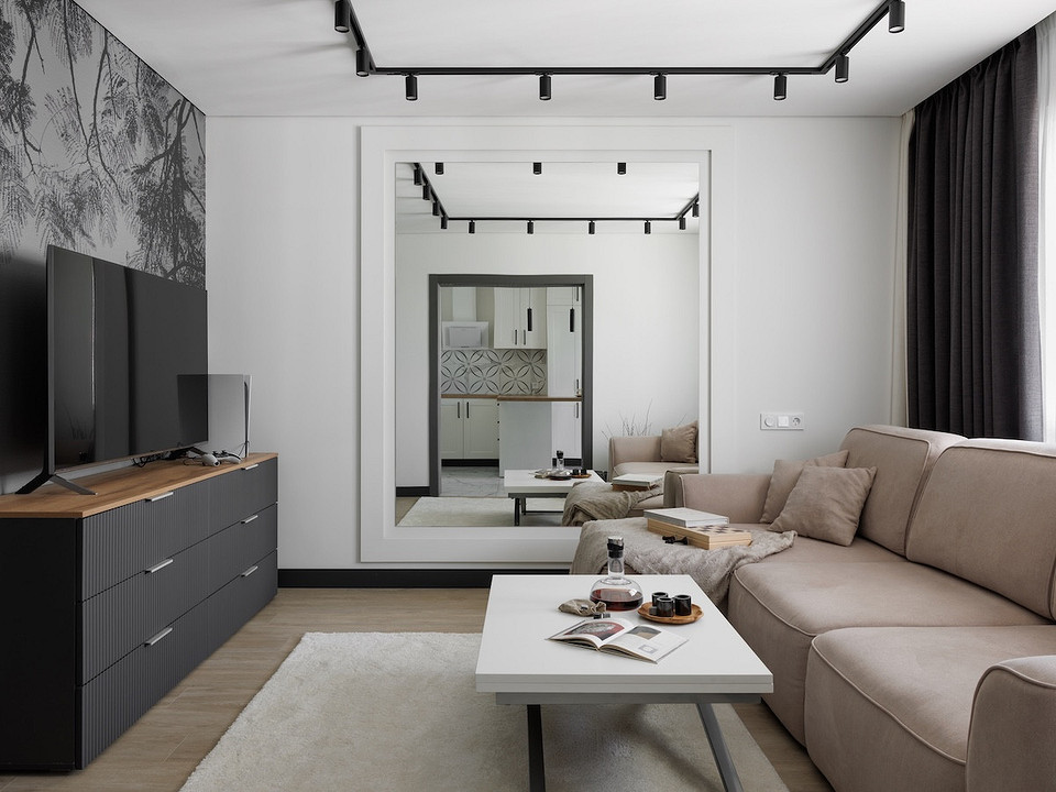 Согласно концепции интерьера, дизайнер выбрала холодные тона для отделки и природные материалы. Основная отделка стен — краска. На полу в комнатах уложен паркет. В гостиной и спальне применили обои-панно для акцентных стен. В гостиной это крупный растительный рисунок, а в спальне — текстура горных пород. «Использование текстуры горных пород в спальне подчеркивает уникальность северного региона и придает комнате особую индивидуальность», — комментирует Александра.
