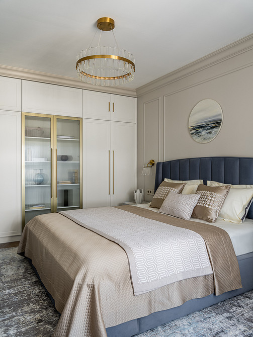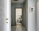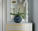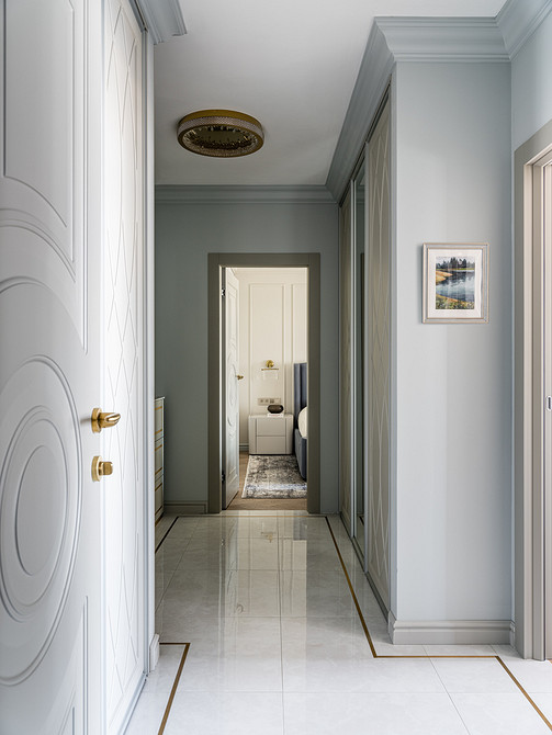 Для отделки стен использовали краску. В общих помещениях — прихожая, кухня — стены серо-голубого цвета. В спальнях — нежного бежевого. В те же цвета окрашены и потолочные карнизы, что позволяет визуально увеличить потолок. Стены декорировали молдингами.