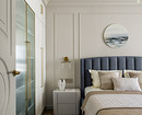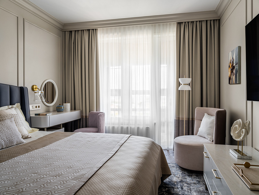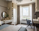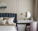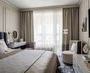 У кровати с одной стороны — тумбочка, а с другой — туалетный столик. Напротив кровати разместили комод.
