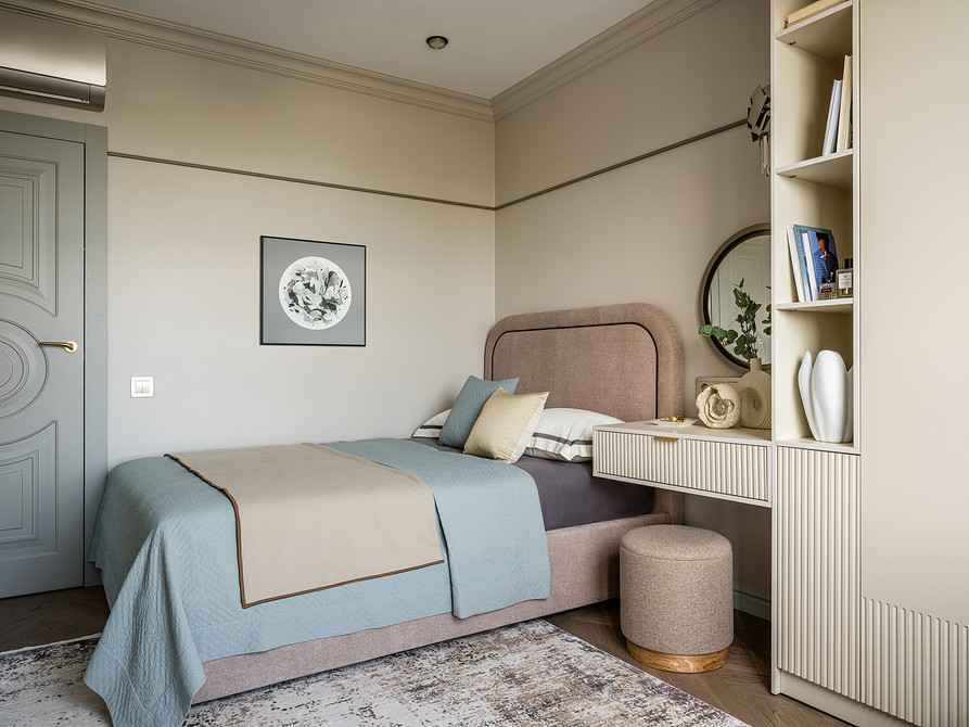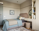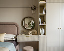 Хозяева просили дизайнера о конкретном функционале: было необходимо поставить в обеих комнатах туалетные столики, в комнате дочери продумать рабочее место и хранение книг и необходимой техники, в ванной комнате разместить места для хранения гигиенических средств, а в прихожей — закрытую обувницу, предусмотреть отдельный хозяйственный блок со стиральной и сушильной машинами.