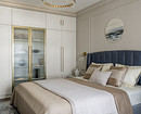 В спальне хозяев шкаф встроен во всю длину стены напротив окна. Часть секций закрыли стеклянными дверками — они предназначены для книг и декора.