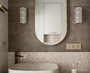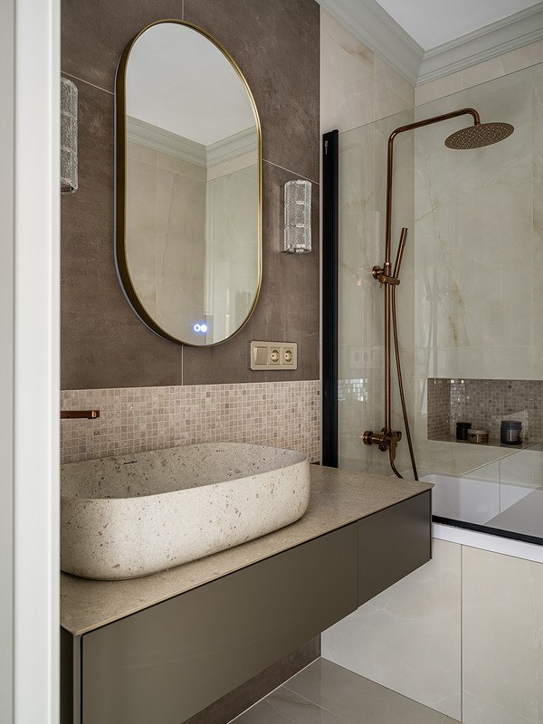В ванной комнате использовали несколько видов отделки. Это крупноформатный керамогранит под камень в бежевых и коричневых тонах и мозаика в таких же оттенках. Цвета и материалы перекликаются друг с другом, что делает ванную комнату элегантной и не скучной.