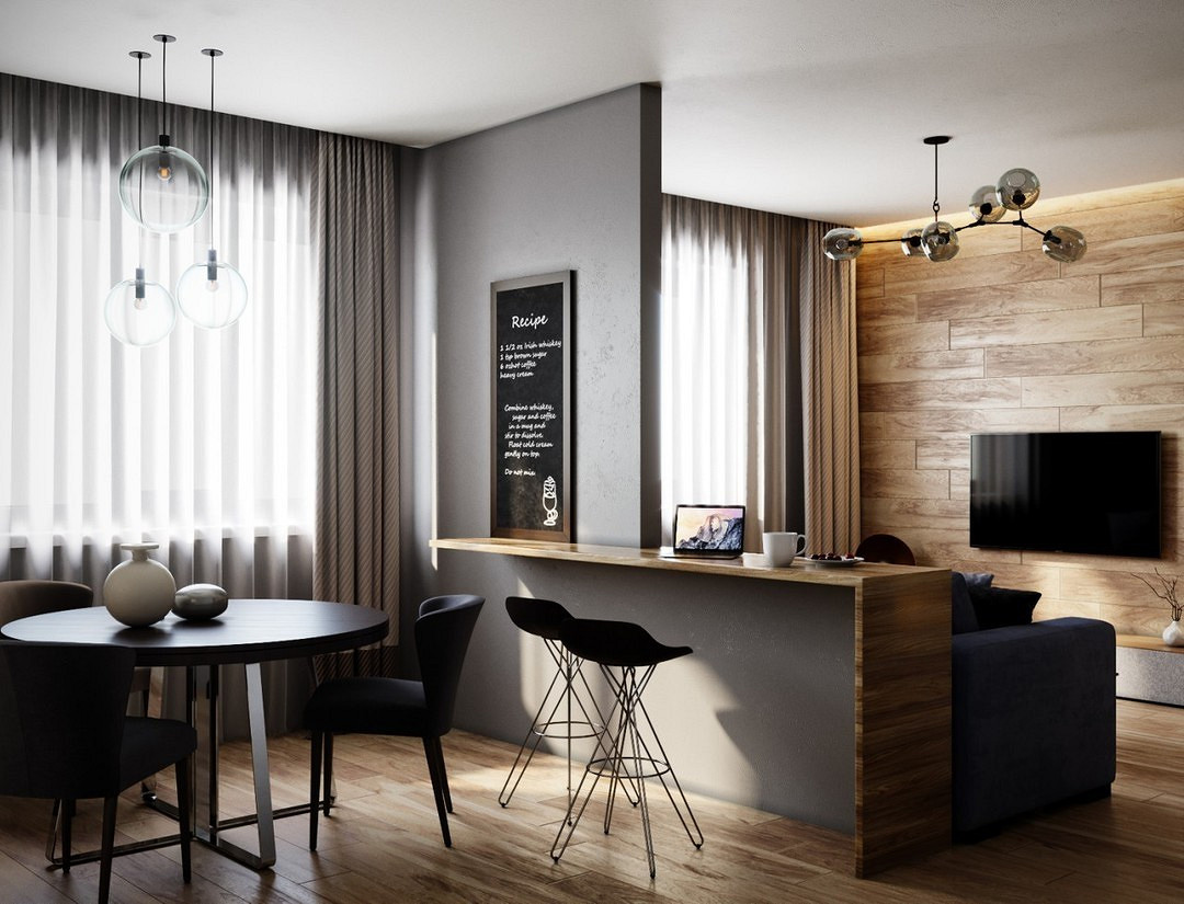 Вместо фартука таким образом иногда оформляют обеденную зону, если нужен акцент в этой группе. Чаще всего это решение встречается в объединенных пространствах гостиной, кухни и столовой.