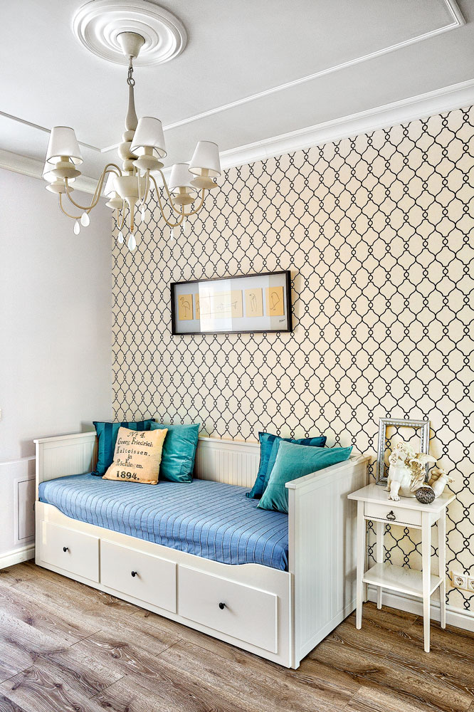 Узор обоев в кабинете напоминает игру света и тени на рельефных элементах отделки студии. Белоснежная люстра почти незаметна