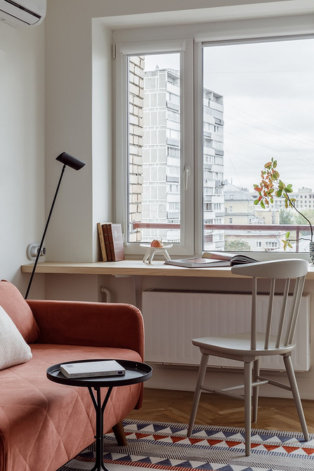 Хозяин не хотел делать перепланировку, работали с исходными данными: изолированная комната, небольшая кухня, санузел, коридор и лоджия. В комнате оформили три зоны: сна (кровать), отдыха (диван) и работы (стол-подоконник).