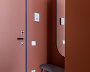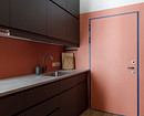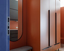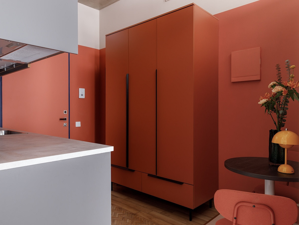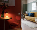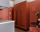 Дизайнерам удалось подобрать готовый шкаф того же цвета, что и терракотовые стены. Прямо у входа поставили пуф с зеркалом. Обеденный стол с терракотовыми стульями, которые тоже идеально подходят по цвету, поставили тут же.
