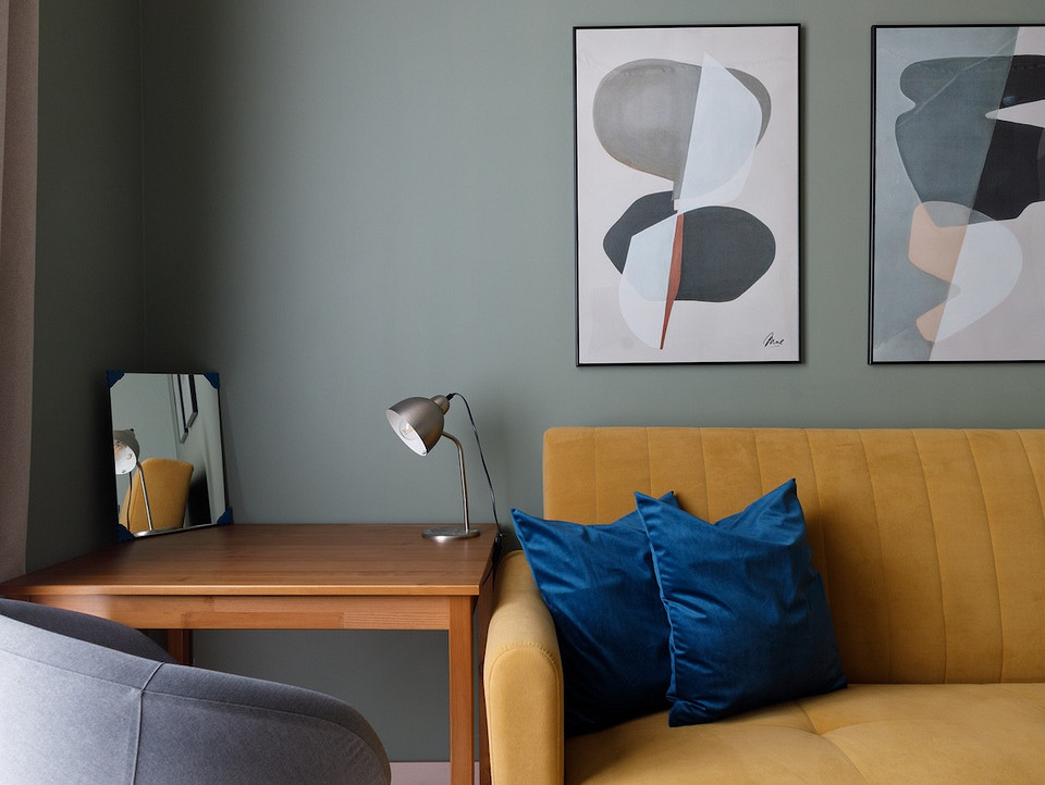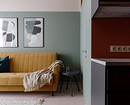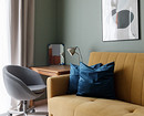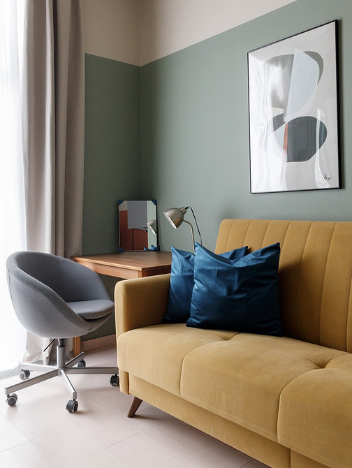 В гостиной зоне — желтый диван, контрастный к цвету стен. Также предусмотрено рабочее место. И диван, и стол были выбраны заказчиком самостоятельно.