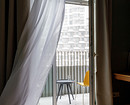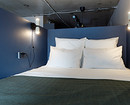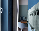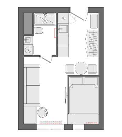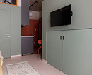 Хозяин придумал перенести кухню в прихожую, чтобы комната стала полноценным жилым пространством. Для этого вход в санузел перенесли. Еще одна функциональная идея планировки, принадлежащая владельцу — кровать на подиуме. Таким образом спальное место выглядит обособленным без дополнительных перегородок. А в высоком подиуме, тем временем, можно организовать вместительное хранение.