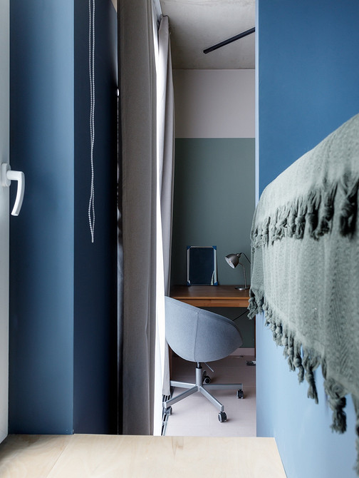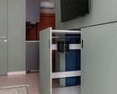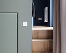 Главная фишка хранения в этом проекте — скрытый шкаф в подиуме под кроватью. Эта идея принадлежит хозяину квартиры, но доработана дизайнерами. Вместе с мебельщиком они разработали выдвижные системы, предусматривающие хранение одежды на плечиках и полках. Дверцы — скрытые, выкрашенные в тот же зеленый цвет, что и подиум.