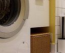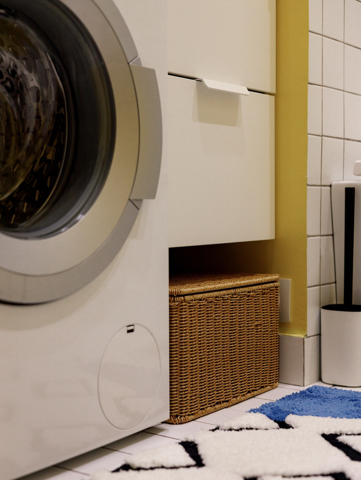 В ванной комнате была установлена тумба под раковину со стиральной машиной. Дизайнеры придумали поставить корзину под тумбой, чтобы убрать визуальный шум с хранением разных хозяйственных средств. Подобрали круглое зеркало.
