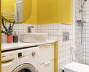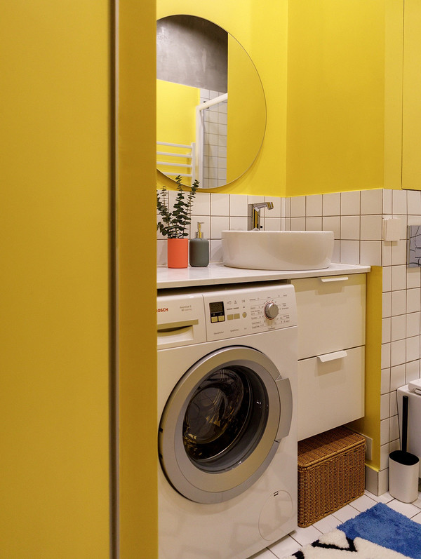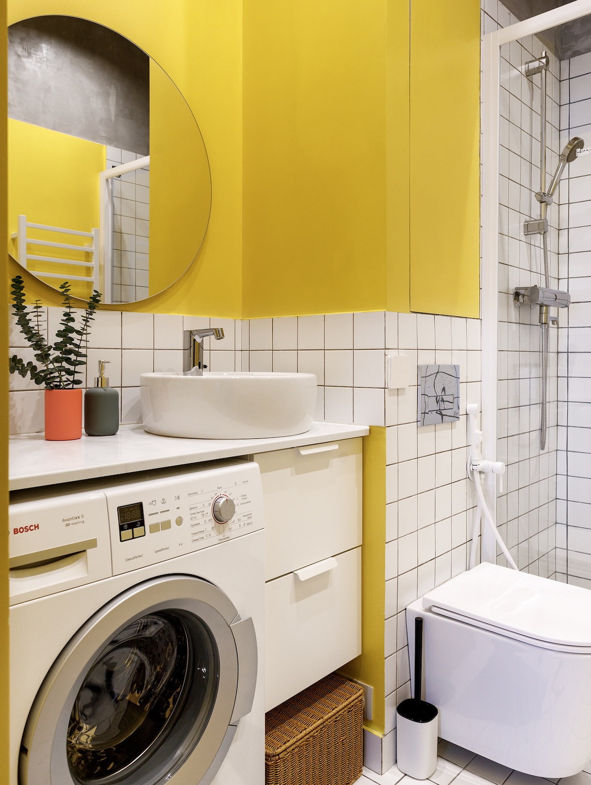В санузле скомбинировали белую квадратную плитку с желтой краской. «Желтый цвет стен в ванной комнате — это заряд бодрости по утрам и солнечное настроение в любое время года. В сочетании с белой плиткой и белой сантехникой это помещение становится максимально светлым и просторным при своих небольших габаритах», — комментируют Дарья и Анастасия.