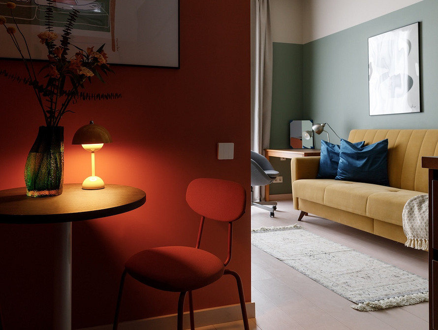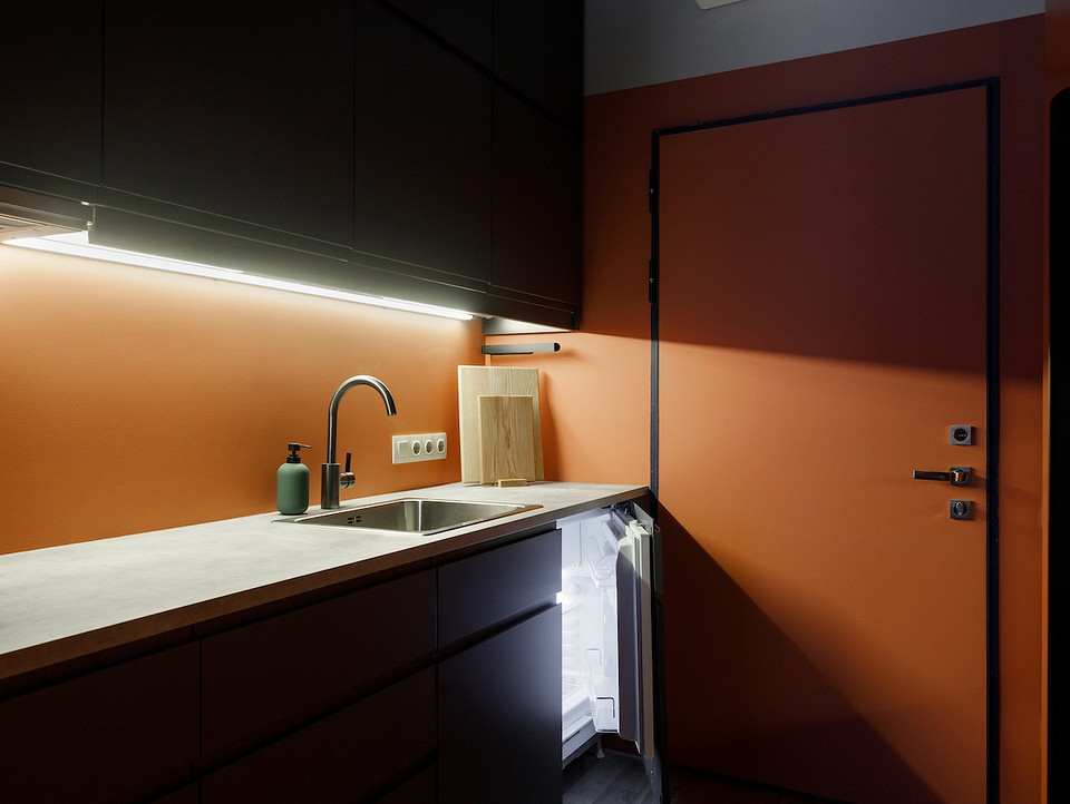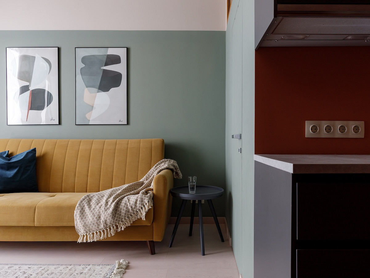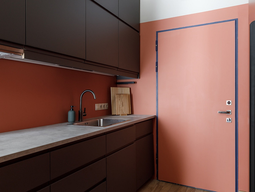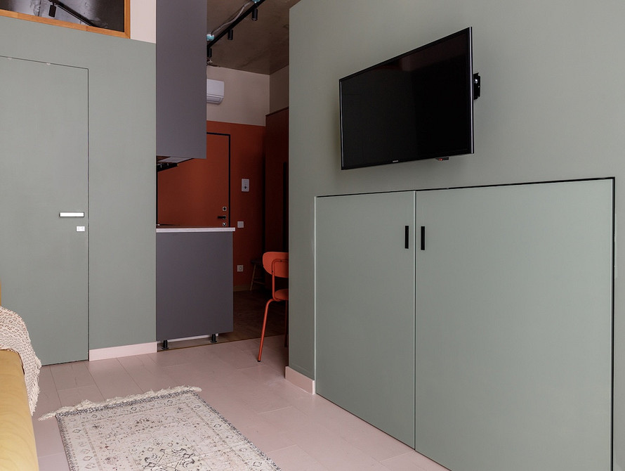 Для отделки стен выбрали краску — это позволило реализовать несколько задач: легкая переделка в случае порчи стен арендатором, а также цветовые блоки, ведь краску можно колеровать в любой оттенок. Для кухонной зоны выбрали яркий терракотовый цвет, для гостиной — приглушенный зеленый оттенок, а зона спальни окрашена в глубокий синий.