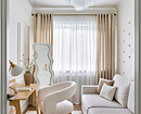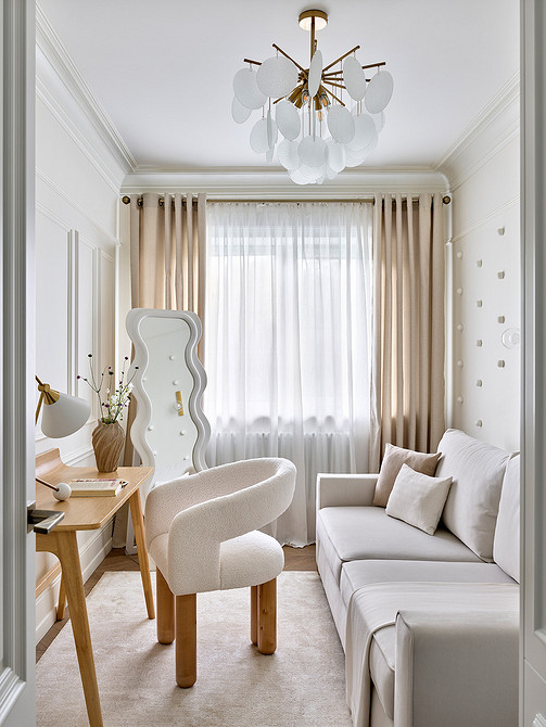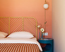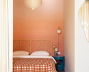 Квартира по проекту Анастасии Заркуа предназначена для сдачи в аренду. Однако это не стало препятствием для заказчицы пригласить дизайнера и создать качественный, стильный и запоминающийся интерьер. Пространство оформлено в теплых тонах. В зоне спальни, которая отделена от гостиной только шторой, сделан акцент в виде окрашенной стены. Однако покраска необычная: не в один тон, а в технике градиент. Снизу приглушенный оранжевый переходит в светлый почти бежевый. И даже потолок в спальне не белый, а в цвет остальных стен, чтобы не создавать резкого контраста, а подчеркнуть эффект уютной шкатулки.