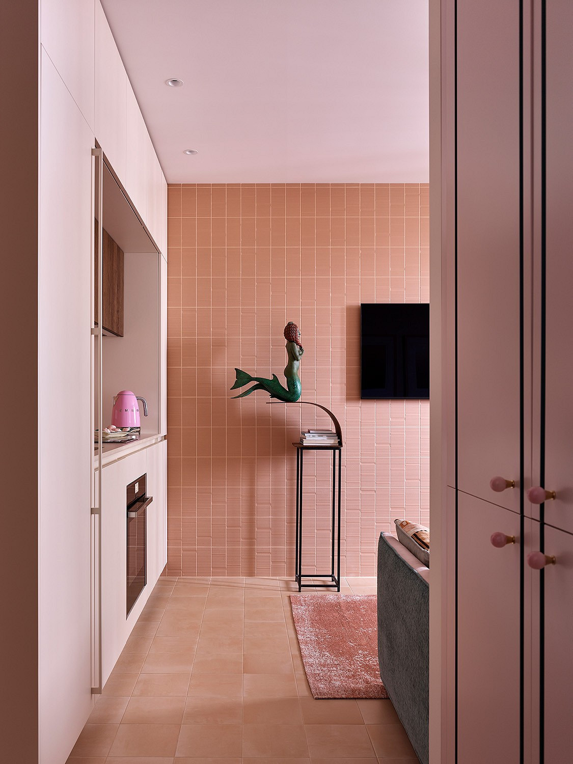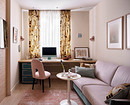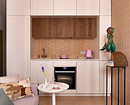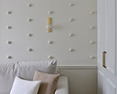 Эту квартиру дизайнер Марина Жеренко оформляла для девушки-студентки. В интерьере использовали нежные приглушенные цвета. Стена с телевизором в гостиной отделана плиткой. Такую же применили в отделке кухонного фартука. И если керамика на кухне никого не удивит, то в телевизионной зоне — да. Однако дизайнер выбрала рельефную плитку, которая похожа на настенные панели. К тому же теплый цвет, подходящий общей гамме комнаты и квартиры, совсем не делает пространство «холодным», ведь именно такие ассоциации часто возникают с плиткой.