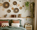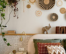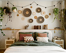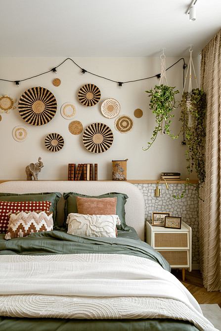 Эта квартира по проекту дизайнера Динары Шигаповой принадлежит девушке. По просьбе хозяйки Динара создала интерьер с отпускным настроением. Здесь много света, натуральных материалов, зелени. В спальне на стене за изголовьем кровати сделали выступ, чтобы получилась полочка. Этот выступ отделали мозаикой из мрамора. Декор в меру нейтральный, но при этом со своим шармом — природный и рукотворный. Стену над полкой декорировали плетеными тарелками и «салфетками», гирляндой из лампочек, а под потолком разместили зеленые растения в плетеных кашпо.