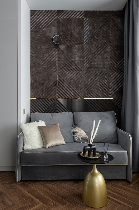 Дерево в качестве акцентной стены — идея не новая. Уже много лет мы видим, как используют рейки в качестве акцента, однотонные панели из МДФ под дерево или шпонированные. В этом интерьере дизайнер Ани Овсепян применила для акцентной стены за диваном рифленое дерево. Панели выполнены в виде квадратов и складываются в абстрактный рисунок. За счет неоднородного цвета и объемной поверхности они смотрятся необычно. При этом отлично подходят в этот элегантный интерьер, не упрощая его.