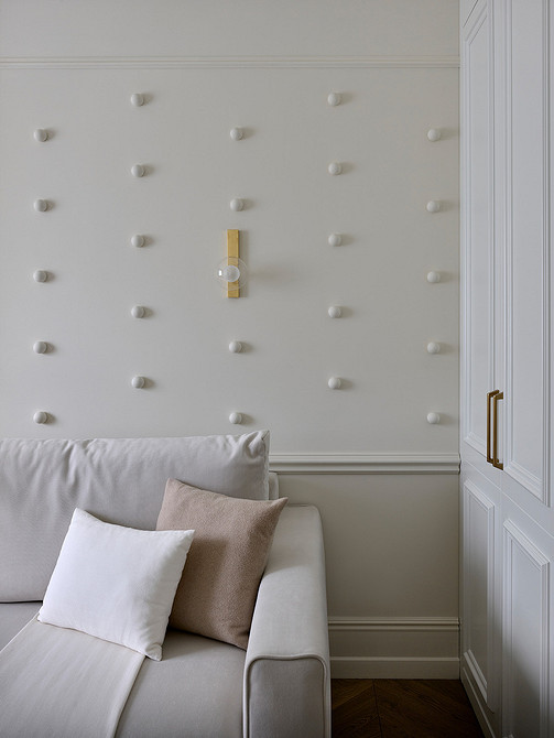 Этот дом создавался дизайнером Ириной Горячко для взрослой семейной пары и их большой семьи — детей и внуков. В доме продумано несколько гостевых комнат, включая одну — детскую. И именно для нее дизайнер придумала необычный акцентный декор. На стену наклеили широкий молдинг для имитации панели в нижней части, а на оставшейся поверхности разместили дверные ручки-кнопки, окрашенные той же краской, что и стены. Получился игривый и простой в исполнении декор, который может повторить каждый.
