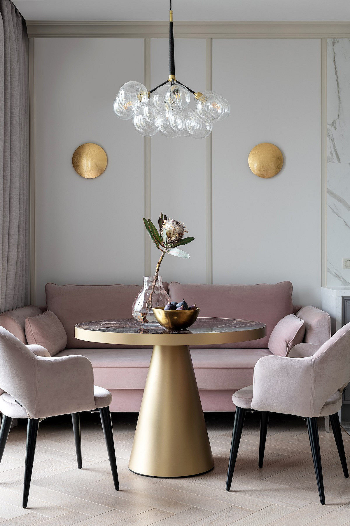 В качестве основного освещения предусмотрели точечные светильники с латунной отделкой — в тон другим деталям интерьера. Декоративный свет — подвесы по бокам от кровати, в прихожей, люстра над обеденным столом, у зеркала в ванной — также подбирали с латунными деталями, чтобы добиться гармонии.