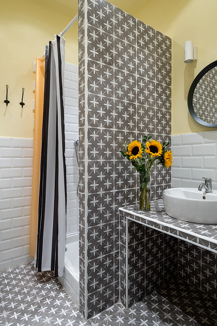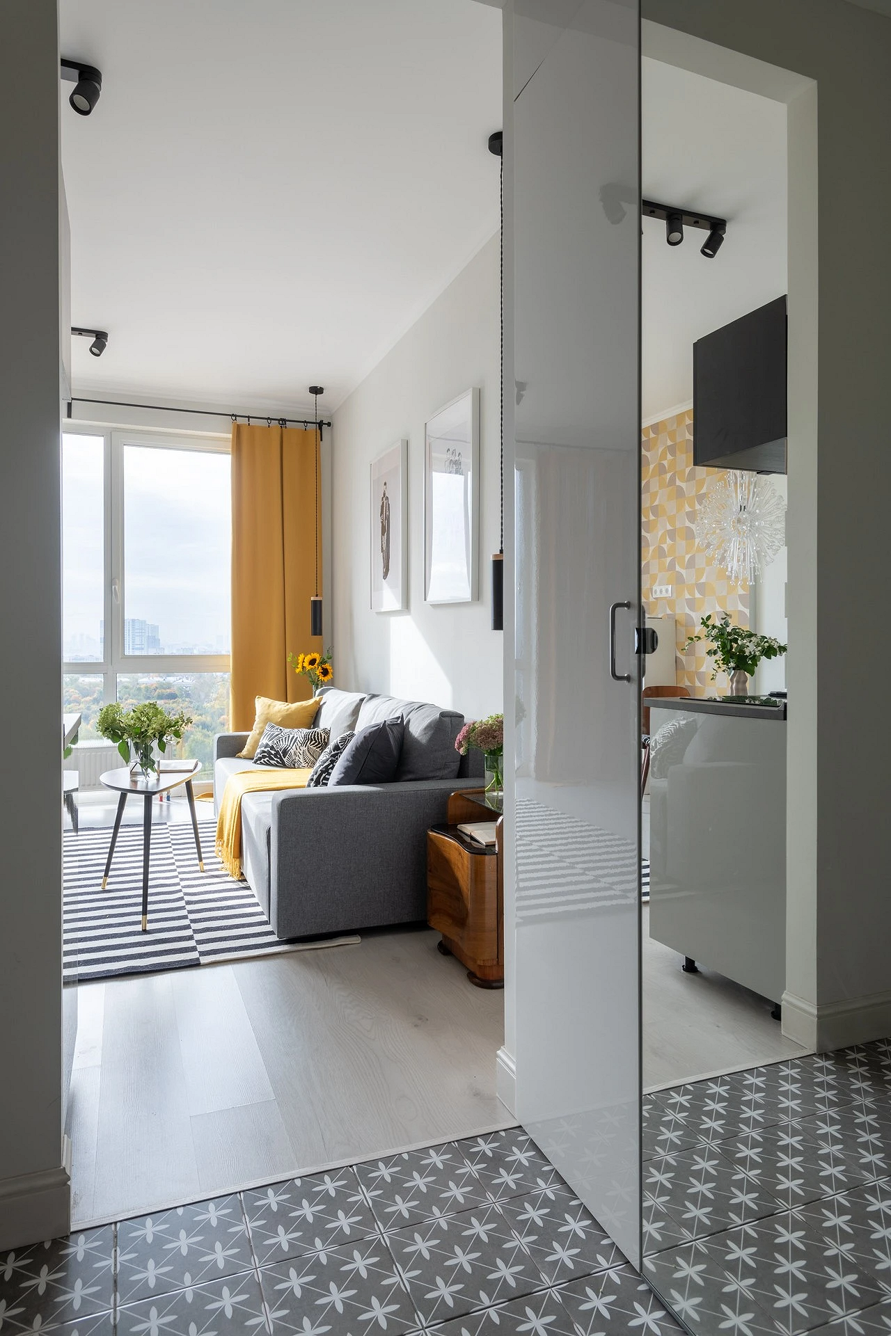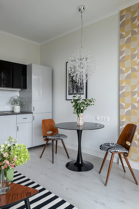 Эта небольшая квартира предназначена для сдачи в аренду. Изначальную планировку студии не меняли, только возвели стены там, где было необходимо. Остальное пространство оставили открытым: зона кухни, столовой и гостиной-спальни плавно перетекают друг в друга. Интерьер оформили лаконично и в то же время стильно. Характера добавляют детали: акцентная стена с яркими обоями, винтажные тумбочки и стулья, а еще декор в том же духе — например, постеры советских графиков. Эти акценты создают необходимое настроение и делают простой интерьер стильным и необычным. А теплые оттенки желтого добавляют ощущение солнечного света в комнате и разбавляют нейтральную серо-белую гамму.