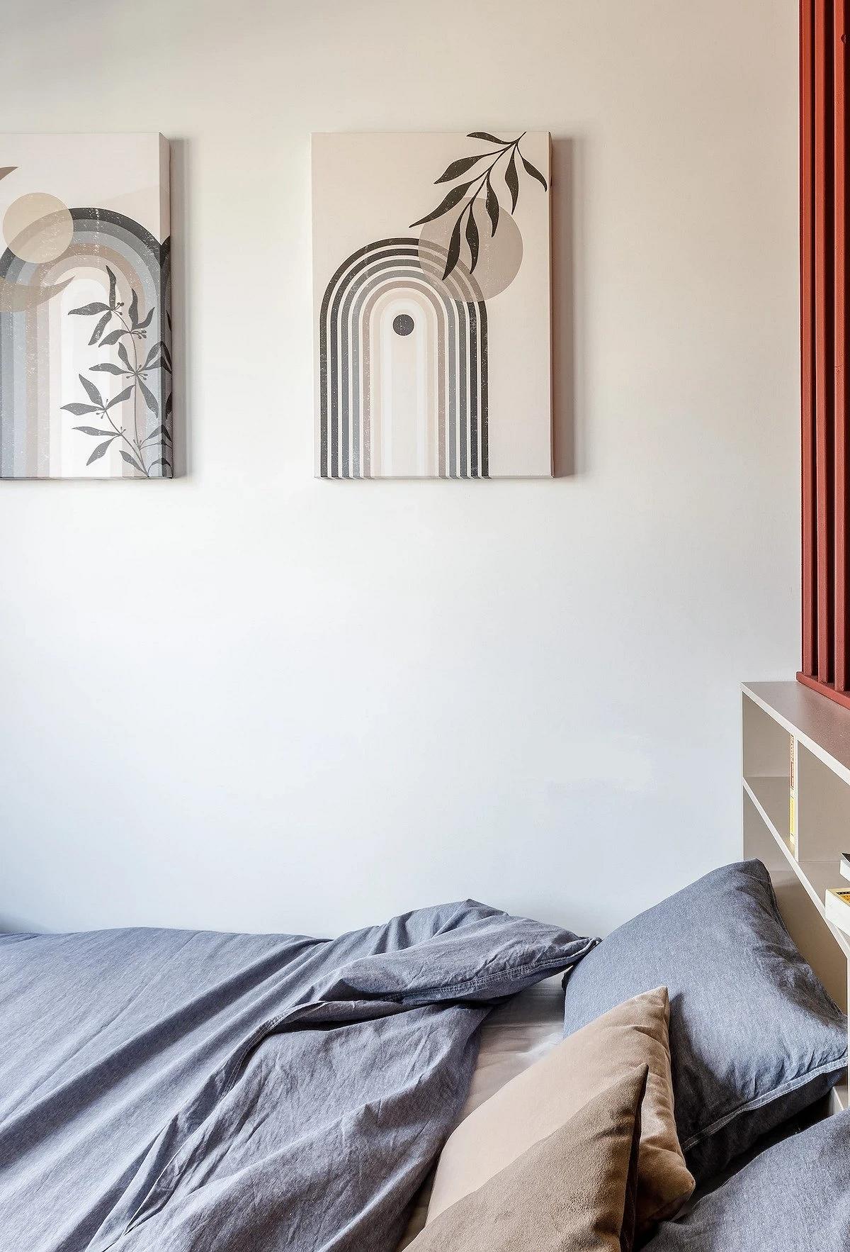 Компактная площадь этих апартаментов не помешала оформить удобный интерьер, где задействован буквально каждый сантиметр площади. Студия будет сдаваться в аренду, поэтому важно было учесть универсальные жизненные сценарии. Так, пространство разделили на несколько зон. Основная представляет собой кухню-гостиную с барной стойкой, которую можно использовать и как обеденную, и как рабочую зону. Место для отдыха представлено небольшим мягким диванчиком с книжными полками рядом и ТВ-зоной напротив. Спальня располагается у окна за реечной перегородкой, которая визуально делит апартаменты на две отдельные «комнаты». Благодаря просветам в рейках и открытому проходу сбоку в зону кухни-гостиной беспрепятственно проникает естественный свет из окна.