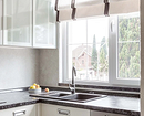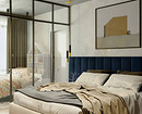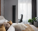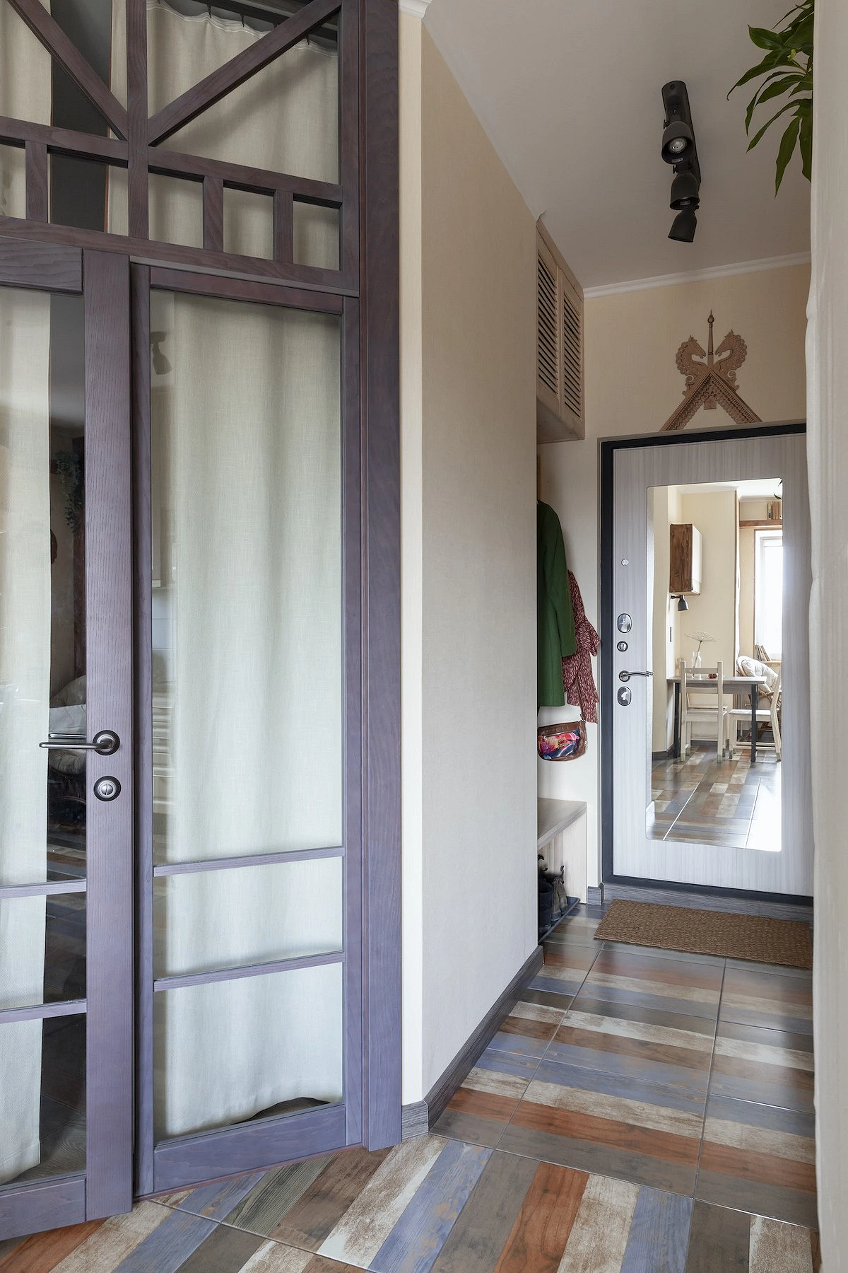 Сыну отдали часть с окном, поскольку ему нужно учиться. Мамина спальня без окна, но там сделали вентиляцию и вместо одной из стен установили стеклянную перегородку с дверью, чтобы в комнатку попадал свет из окна на кухне. Рядом с зоной готовкой поставили компактную обеденную группу, а также выделили место под уголок для отдыха с диваном, креслом и маленьким столиком кофе или чая. Таким образом компенсировали отсутствие гостиной. В прихожей организовали несколько систем хранения, а также дизайнер спроектировала неглубокую нишу, куда прячется встроенная гладильная доска. В закрытом виде она прячется за рулонной шторой в тон отделке.