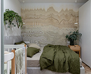 Менять жилье они планируют через несколько лет, когда сын подрастет, пока же семье достаточно одной жилой комнаты. Благодаря вытянутой форме ее было удобно разделить на два блока: при входе компактная родительская спальня, а у окна за стеклянной перегородкой уютная детская зона. Сын еще совсем маленький, и ему не нужен стол для учебы или хобби. Поэтому вдоль окна поставили кроватку с полочками и комод. Осталось и немного места для игр в зоне видимости взрослых.