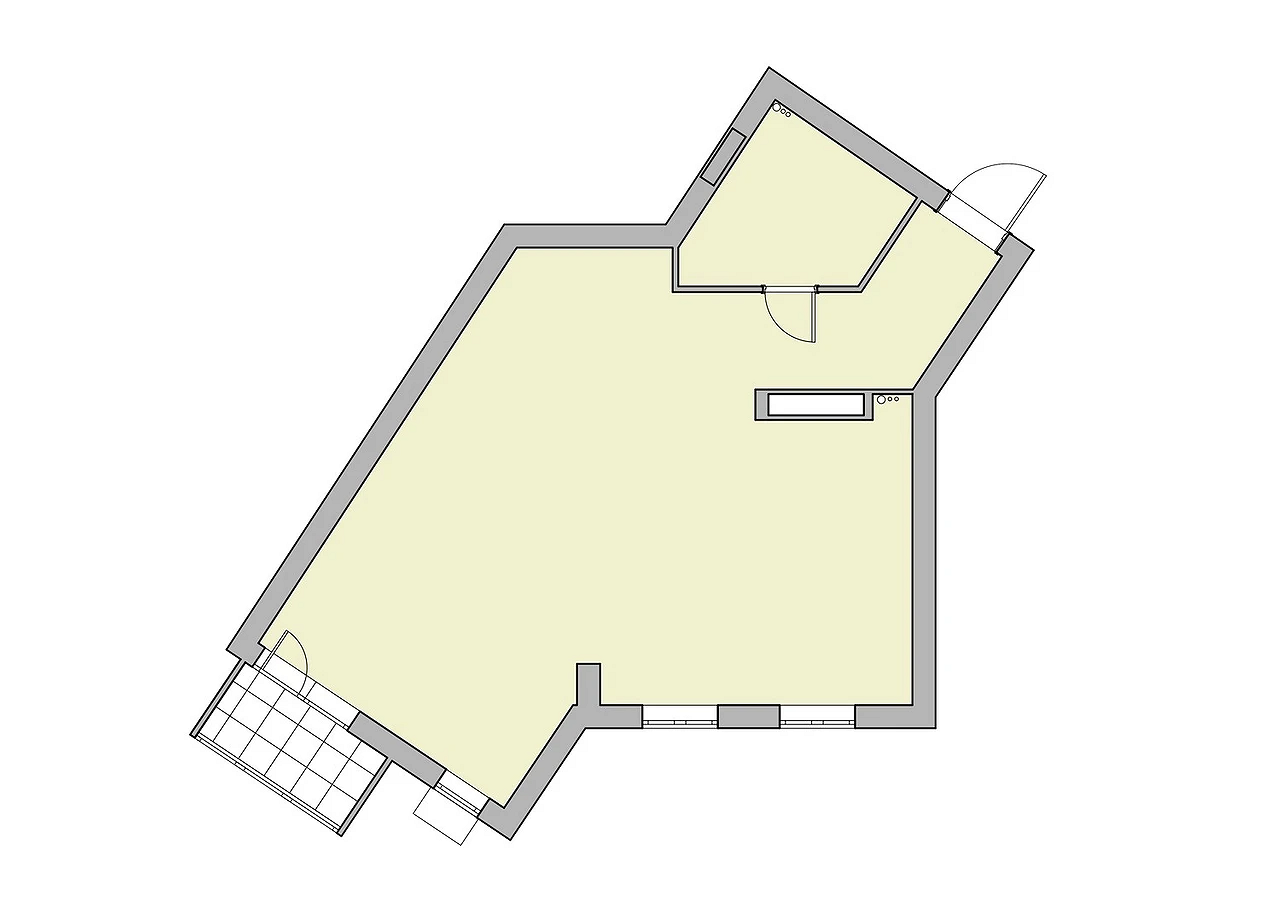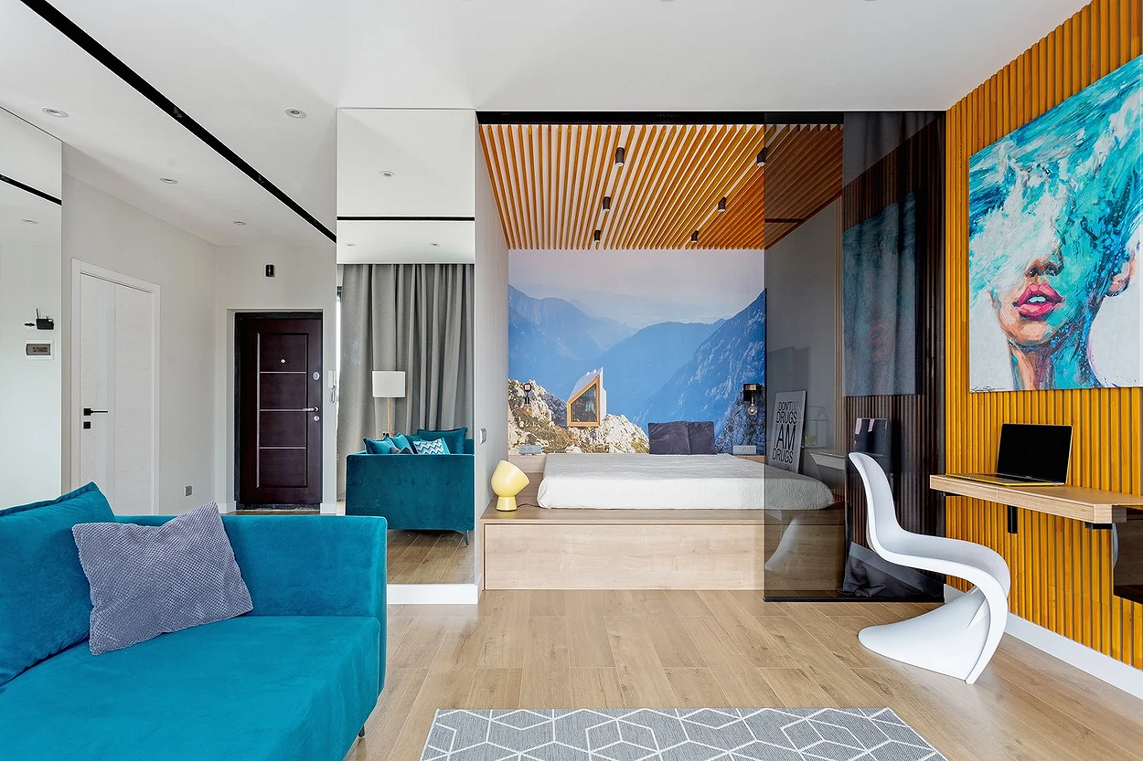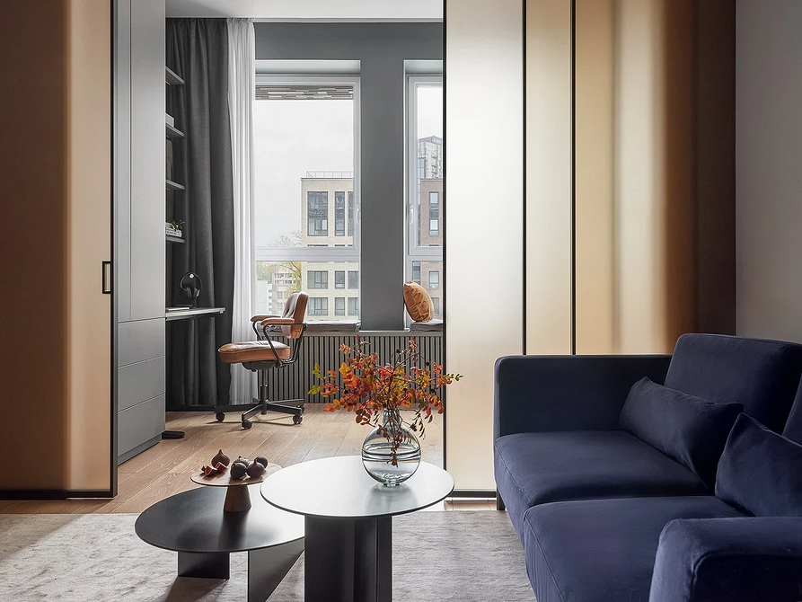 В такой квартире нет изолированных комнат: кухня, гостиная, спальное место находятся в одном пространстве. Площадь 15-25 квадратных метров для троих жильцов — очень мало, но есть и более просторные варианты, по метражу сравнимые с типовыми однушками. В этом случае чаще всего одно или два спальных места зонируют перегородками, получая подобие отдельное комнаты. Кто-то может спать на удобном раскладывающемся диване в зоне кухни-гостиной.