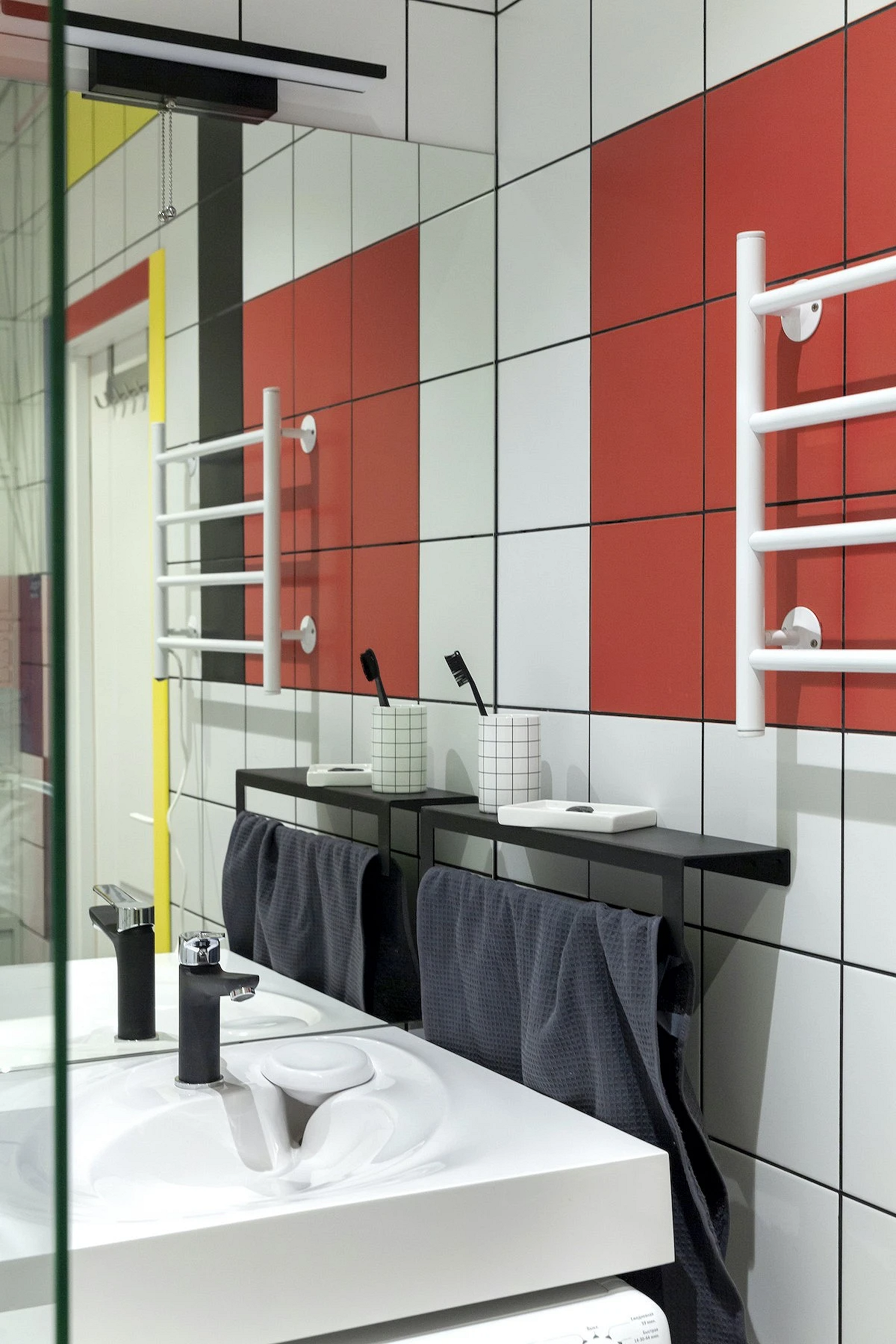 Общая же комната разделена стеклянной раздвижной перегородкой на детскую и взрослую часть. Для родителей сделали диван-кровать-шкаф — удобный трансформер, который позволяет днем превращать комнату в полноценную гостиную, а вечером — в спальню. Над изголовьем — закрытая система хранения, которая воспринимается как продолжение отделки. Для детей же установили смежные двухъярусные кровати с ящиками, разделив их по цветам. Места для хранения предусмотрены и в других комнатах: на кухне это угловой гарнитур под потолок, в ванной — тумба под раковину и два хозяйственных шкафчика.