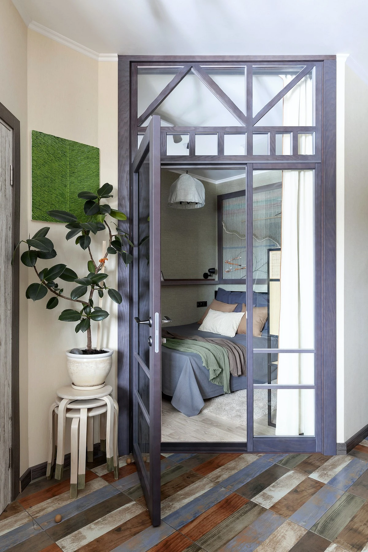 Именно такой прием использовали в этой небольшой курортной квартире для семейной пары и их двух дочерей. Изначальная планировка была свободной, пространство распределили по принципу евродвушки: большая общая зона и более маленькая приватная часть. Но чтобы не создавать ощущение крошечных тесных комнат, часть глухих перегородок заменили прозрачным стеклом. Так в каждом уголке хватает естественного света, и в целом интерьер кажется легче и просторнее. Квартира предназначена для временного проживания, поэтому здесь не так много систем хранения. Но при желании в подобном проекте их можно увеличить, например, добавив шкаф в гостиную или ящики под кровати.