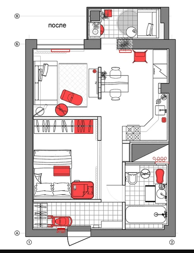 Она предполагает изолированную кухню и одну жилую комнату, самую большую по площади. Такие планировки характерны и для старого фонда, и для квартир в новостройках. Чаще всего жертвуют полноценной гостиной, оформляя небольшую зону отдыха на кухне. А единственную комнату превращают в спальню и детскую. Иногда туда же добавляется рабочее место. Хорошо, если есть балкон: его можно утеплить и перенести мини-кабинет туда либо организовать там систему хранения.