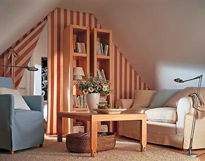 Из-за скошенных участков потолка комната изначально казалась слишком маленькой. На самом деле это обман зрения - ее площадь ровно 20 м2 [4]. Дизайнер перво-наперво решила разделить помещение на две части, чтобы добиться большего уюта. Стационарная перегородка смотрелась бы, по ее мнению, слишком тяжеловесно, поэтому был выбран более "легкий" вариант - ткань. Так в комнате образовались две независимые зоны - спальная и гостиная. Их разделяет полосатый экран, образованный из трех полотнищ. Он крепится специальными кнопками к планкам, которые, в свою очередь, прибиты к скатам потолка и полу [5].