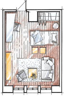 В ближайшей к входу половине помещения оборудована спальня. Здесь же выгородили небольшой уголок для письменного стола. Слева от двери, под самым скосом потолка, находится большая кровать со стеганым изголовьем. Рядом, в нише между стеной и дымоходом, было решено поместить встроенный шкаф. Письменный стол поставили напротив, под мансардным окном (производства фирмы VELUX). Чтобы стол не мешал проходу в другую часть мансарды, в гостиную, один его угол срезали по диагонали [6].