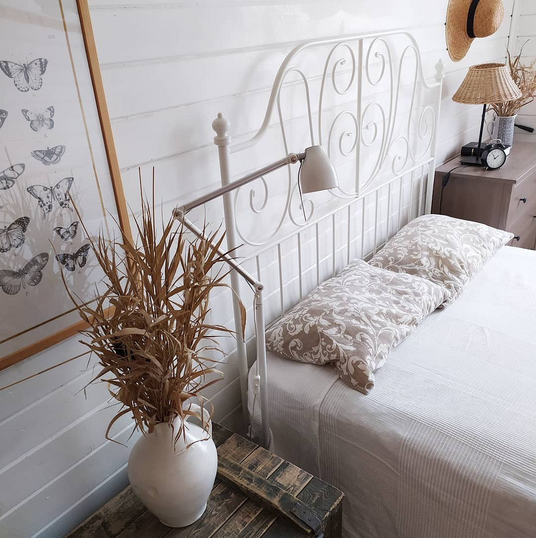 Это еще одна кованая кровать из ИКЕА, которая подойдет в самый простой интерьер, без большого количества деталей. Всё дело в форме: высокое изголовье украшено замысловатыми завитками. Однако корпус выглядит легким благодаря белому цвету и изящному каркасу на тонких ножках. Размер стандартный: 160х200 см.